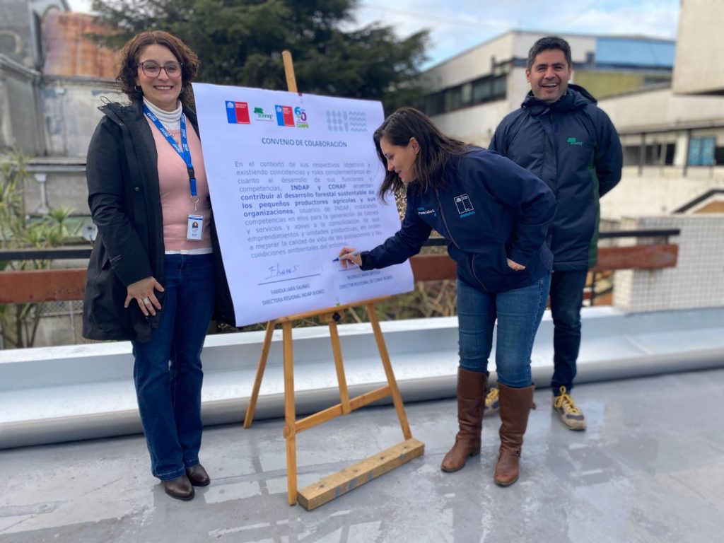 Esta mañana, la Seremi de Agricultura, Pamela Yáñez; el director regional de CONAF Biobío, Rodrigo Jara, y la directora de INDAP Biobío, Fabiola Lara, celebraron un convenio de colaboración para fortalecer el desarrollo forestal sustentable de pequeñas y pequeños productores agrícolas y sus organizaciones en la región del Biobío.