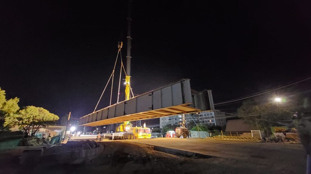 Con movimiento de una grúa de 30 metros, durante la madrugada de este jueves comenzó la instalación de vigas del nuevo Puente Collao que cruza el estero Nonguén, en Concepción y que es parte de las obras de Mejoramiento Par Vial Collao – General Novoa 2B.