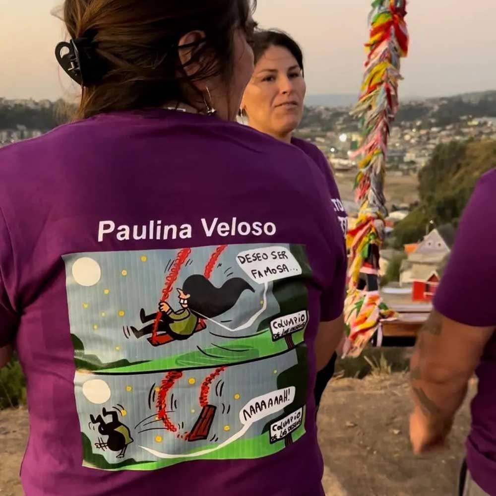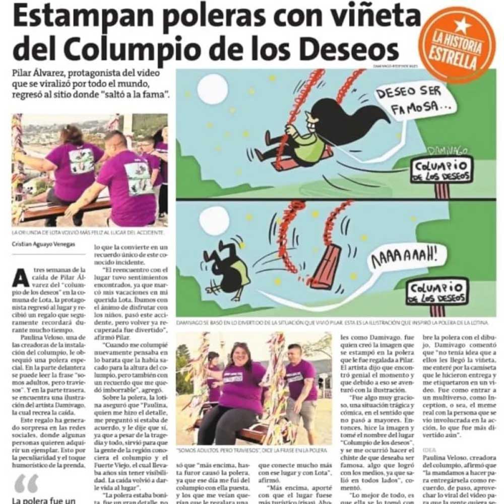 A tres semanas de la caída de Pilar Álvarez del “columpio de los deseos” en la comuna de Lota, la protagonista regresó al lugar y recibió un regalo que seguramente recordará durante mucho tiempo. Paulina Veloso, una de las creadoras de la instalación del columpio, le obsequió una polera especial. En la parte delantera se puede leer la frase “somos adultos, pero traviesos”. Y en la parte trasera, se encuentra una ilustración del artista Damivago, la cual recrea la caída. Este regalo ha generado sorpresa en las redes sociales, donde algunas personas quieren adquirir un ejemplar. Esto por la peculiaridad y el toque humorístico de la prenda. Para mayor información ponerse en contacto con las redes sociales de Paulina Veloso
